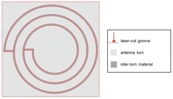 Femtosecond laser ablation was used to cut contours into a 100  thick stainless spring steel sheet (DIN EN 10088 1.4310). A laser micromachining workstation (microSTRUCT C by 3D Micromac), equipped with a Yb:KGW femtosecond laser source (PHAROS by Light Conversion) was used, which emits at  1028 . For fast patterning, the laser beam was deflected using a scanner (Intelliscan 14 by Scanlab GmbH) and a  telecentric FTheta Lens (Linos AG). Per antenna turn, two contour grooves were laser-cut into the sheet metal as shown in Figure 4 using the parameters listed in Table 1.