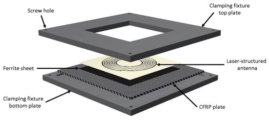 Since the antenna structure was initially fabricated without the underlying magnetic foils and CFRP layers, a fixture depicted in Figure 5 was designed to attach the antenna as close as possible to the other components at this stage for reproducible results. This fixture contains a small recess into which different CFRP plates of the same geometry could be inserted in exactly the desired orientation and position. Another recess inside the top plate was used to fixate the laser-structured antenna. The ferrite sheet was glued onto one side of every sample CFRP plate to allow for measuring on ferrite and directly on CFRP by turning the plate around. The whole stack of the antenna, ferrite, and CFRP could be compressed to rebuild the later material stack, using this fixture and applying four screws and tightening them with nuts.