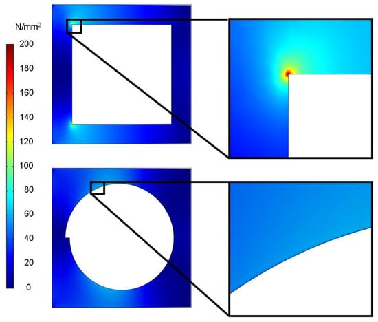 The antenna is intended to be structured into the outer material layer of the FML in the final application, so that there is a void inside the material in which the antenna structure is placed. An FEM simulation was performed investigating the impact of different geometric voids inside a 120 μm thick, 70 mm by 70 mm stainless-steel plate. The dimensions were chosen to comply with the plate size and steel foil thickness of the targeted prototype. This step investigates the influence of different void shapes on the stress distribution for one stainless-steel layer without CFRP layers beneath, since only the top layer contained a hole in the shape of the antenna. Therefore, the plate was first simulated without voids to obtain the maximal von Mises stress over the plate without an opening in the material. Plates with rectangular and circular voids were then modeled. The plate was fixed onto the left side and bent down on the opposite side. Von Mises stress is depicted for the investigation. The 0.2% proof strength for the investigated type of stainless-steel 1.4310 (X10CrNi18-8) is provided with 195 / in the material data sheet. Figure 7 depicts the comparison between the two different void shapes.