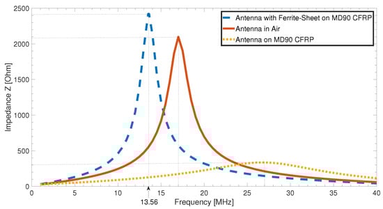 Figure 9 shows the impedances of the antenna measured on different substrates. The solid red curve represents the impedance of the antenna on its adhesive tape placed in the air without magnetically influencing materials near it. The resonance frequency was 17 , which is quite close to the theoretically calculated resonance frequency of  . The quality factor, determined by the maximal impedance value divided by the bandwidth of the impedance at  dB, is . An almost direct placement on a CFRP plate with a 0/90 layer configuration with only the magnetically transparent handling sheet inbetween leads to a shift of the resonance frequency to 27 , shown by the yellow dotted curve. Additionally to the frequency shift, the impedance curve is also strongly attenuated, the quality factor reduces to . These two effects combined are the reason why the RFID system would not work close to this CFRP plate without further additions.