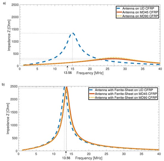 As the frequency shift due to CFRP and ferrite under the antenna can be taken into account by changing the inductance value of the antenna geometry, for direct application on CFRP, it might be possible to shift the frequency back from 27 to  . Theoretically, this might work, but Figure 10a shows that the frequency shift strongly depends on the configuration of the CFRP substrate plate. The dotted yellow and solid red lines showed almost no difference in frequency shift and attenuation; both were CFRP stacks with alternating fiber directions and thus comparably conductive in the z direction. The dashed blue curve, on the other hand, was a plate of unidirectional fiber layers where the resonance frequency had only been shifted to 15 , with attenuation also being significantly lower. Considering this difference, we could also assume that different fiber volume content affects antenna performance and the manufacturing process of each single CFRP component, which theoretically contains more or less contacted fibers. Moreover, the influence of the conductivity of carbon fibers decreases the quality factor of the resonating circuit to  for the unidirectional case, and to  (yellow dotted line) or even  (solid red line) for the multidirectional CFRP substrates. With such low-quality factors, the range of the system would be very low even without any shift of resonance frequency, which prevents high-frequency RFID communication in the first place.