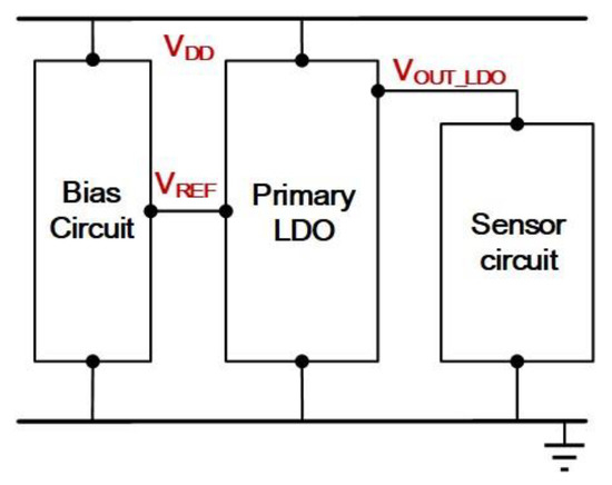 With the continuous advancement of integrated circuit design and manufacturing technology, sensor circuits and systems tend to be integrated together on one single chip. For analog circuits, especially sensor circuits, a high-quality supply source is often needed to maintain their function and accuracy. Although specific circuit methods can be employed to improve the performance of sensor circuits arising from the reduced supply sensitivity in VCO based sensor [1] and reduced supply noise in image sensor [2], these methods are only applicable for the limited case examples. In order to increase power supply rejection (PSR), the sensor circuit employing the feedback design [3,4] to the bridge sensing elements is a popular method. However, it relies on splitting a full bridge sensing element into two half bridge sensors. This may not be adequate for many general applications. Due to the feedback mechanism, the loop gain, and the stability become the critical parameters that deal with the PSR performance and frequency compensation, respectively. Besides, other temperature sensors [5,6,7] and an optical mouse sensor [8] have addressed the importance of supply issues based on the impact of supply sensitivity or supply noise on the sensor circuit performance. Regarding recent trend towards low-power consumption, one of the previously reported supply circuits [9] can consume low power. Unfortunately, the circuit topology suffers from the disadvantage of requiring higher supply. Therefore, low-power low-voltage performance becomes one of main agendas in sensor circuit design. The exemplary circuits are low-voltage, low dropout wireless sensor node [10] and low-power low-voltage biomedical sensor IC [11]. Based on the above discussed sensor applications, the Low Dropout (LDO) Regulator is regarded as the common building block used to produce a stable supply voltage to sustain the sensor circuit performance whilst providing adequate PSR as another important characteristic in sensor circuits and systems. Figure 1 shows the general structure of a sensor circuit powered by a LDO regulator in which a voltage reference is generated by a bias circuit to define the output voltage of a regulator.