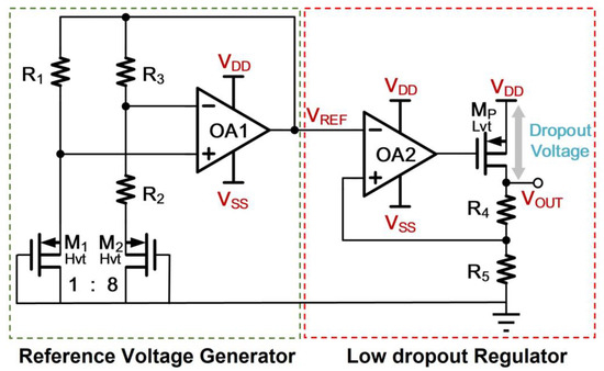 Based on these design considerations, an exemplary op-amp based PSR enhancer that features good PSR topology [15,16] for the enhancer design is depicted in Figure 3. The enhancer comprises a reference voltage generator and a LDO regulator.