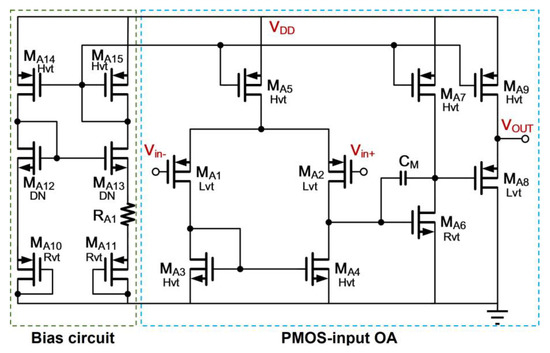 where S1 and S2 are the aspect ratio of M1 and M2, respectively. Thus, a temperature insensitive, VREF, can be realized through adjusting the ratio of R1 and R2. Besides, the employment of sub-threshold based MOS transistors permits the reference voltage generator to operate at low supply voltage and consume low power. The OA1, shown in Figure 4, is a PMOS-input two-stage amplifier with a source follower output stage to avoid the resistive loading effect that influences the open-loop function, resulting in the degradation of PSR. Due to the use of source follower, the output headroom is reduced at the trade-off of VREF and is unable to produce the small dropout voltage design. Regarding the low-dropout voltage design requirement, VREF denoted in Figure 3, will be scaled in the LDO regulator through the scale factor (1 + R4/R5). To minimize the regulator’s circuit complexity, the power transistor stage can be arranged to cascade with the first-stage differential amplifier OA2 to form a two-stage amplifier topology as shown in Figure 5. The well-known cascode compensation technique [17] is applied to obtain a good PSR metric. Finally, the size of each component pertaining to Figure 3, Figure 4 and Figure 5 in the conventional enhancer design is listed in Table 1.