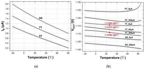 Figure 9a illustrates the variation of CTAT bias current IB(T) at different process corners (FF, TT, SS) at the operation temperatures, ranging from −20 °C to 80 °C. The IB(T) decreases with increasing temperatures across the operation temperature range. It shows 0.8 μA under the SS corner at 80 °C, 0.49 μA under the TT corner at 80 °C and 0.2 μA under the FF corner at 80 °C. This confirms the CTAT characteristic as revealed in (10). Regarding the output voltage, VOUT(T), it is evaluated with different process corners, temperatures and loading currents. The simulated results are shown in Figure 9b. Based on the nominal value of VOUT(T) of 1.1127 V at 27 °C in TT case under the load current of 60 μA, the maximum variation is only +1.8 mV/−1.6 mV across two extreme temperature corners. For other load currents of 0 μA and 500 μA, the change of VOUT(T) is +2.9 mV/−1.8 mV at 27 °C. For variation of process corners, VOUT(T) shifts up/down by about +11.3 mV/−9.7 mV from the nominal value case. This is considered acceptably small. Besides, it is observed that VOUT(T) displays an increase at a high temperature of 85 °C under FF corner and little rise at TT corner, this is due to the decrease in IB(T), causing the circuit more sensitive to biasing parameters.