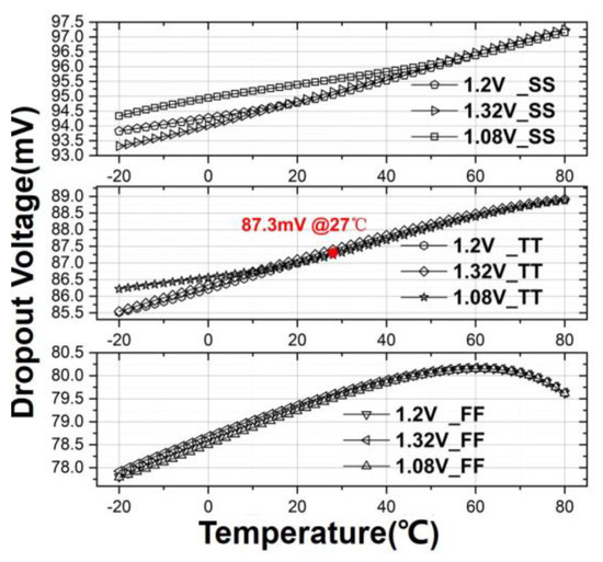 Besides, different simulations are conducted to observe the dropout voltage under three process corners, 1.2 V ± 10% on VDD and different operation temperatures in Figure 11. The results have indicated 87.3 mV under the TT corner at 27 °C, 95.2 mV under the SS corner at 27 °C, and 79.5 mV under the FF corner at 27 °C. The dropout voltage has been observed to be almost invariant to the change of supply voltage; a few mV shifts across the entire operation temperature range and about a few mV change over extreme process corners. This led to the total change of +9.9 mV/−9.5 mV under the extreme PVT case consideration. The result has confirmed that the dropout voltage exhibits good immunity against the combined PVT effect.
