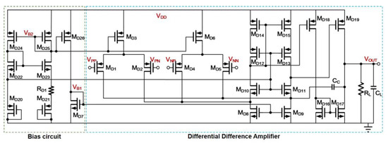 To demonstrate the performance of the PSR enhancer for sensor circuit application, a Differential Difference Amplifier (DDA) [26], which serves as the instrumentational amplifier for detecting a full bridge sensor signal is employed. For fair comparison, the conventional enhancer and the proposed enhancer are designed with identical static power consumption and identical supply voltage of 1.2 V using TSMC 40 nm CMOS technology. Table 3 summarizes the static power of building blocks in each design. The schematic of DDA is depicted in Figure 12. It is a standard architecture with the first- being a stage folded-cascade differential amplifier and the second being a non-inverting gain stage with a feedforward path to form the push-pull output stage. The current consumption of the DDA is 60 μA at about 1.1 V supply line from each enhancer. This is treated as the typical operation condition for each enhancer. The performance summary is listed in Table 4.