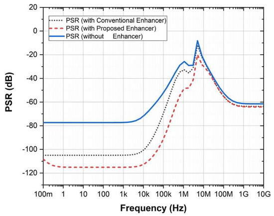 The comparative simulation results are given in Figure 13 and Table 5. It can be concluded that both low-frequency and high-frequency PSR are improved using the proposed design, with respect to the DDA designs with and without a conventional enhancer.