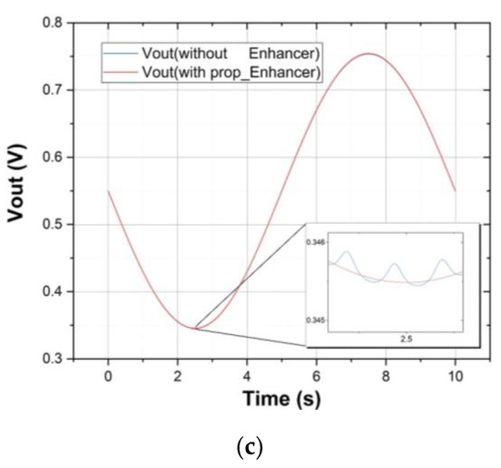 Comparison of time-domain output responses of DDAs with and without proposed enhancer at different noise levels: (a) 100 mVpp@1 MHz; (b) 100 mVpp@10 kHz; (c) 100 mVpp@20 Hz.