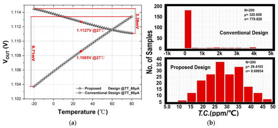 Comparison between conventional design and proposed work of (a) temperature characteristic of VOUT under nominal case; (b) Monte-Carlo simulation of T.C. of VOUT.