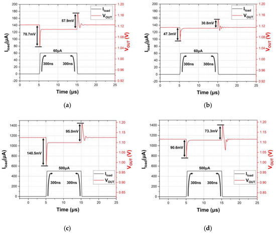 Transient response with 60 μA current pulse of (a) conventional design; (b) proposed work; and with 500 μA current pulse of (c) conventional design; (d) proposed work.