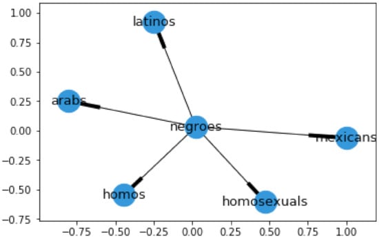 (Contextual Graph) is a weighted directed graph where each vertex represents a word . Edges are represented by the set E. For a pair of vertices , an edge is created if appears in the output of , with as the input word. As an intuitive example, using = negroes from the hate speech list, the output contextual graph can be seen in Figure 1.