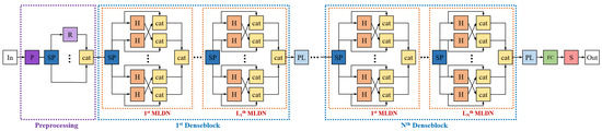 Figure 1 shows the overall architecture of the proposed network. MLDN described in Section 3.2 represents our proposed multipath lightweight deep network. In the figure, P in the dark purple box is the preprocessing module, R in the light purple box is ResNet, SP in the dark blue box splits the input into the number of paths, cat in the yellow box is concatenation, H in the orange box is the composite function of MLDN, PL in the light blue box is the average pooling layer, FC in the green box denotes fully connected layers, and S in the red box is a softmax function. In and out in the white box are the input images and the predicted class, respectively. This network predicts the classes of objects through preprocessing, dense blocks, transition layers (average pooling), fully connected layers, and a softmax function. Preprocessing helps generate diverse feature maps. A denseblock has L MLDN and MLDN has p multiple paths. The various feature maps are produced after passing through each MLDN and denseblock. The pooling layer reduces the size of the output channels of each denseblock.