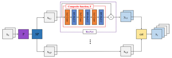 Here, n is the index of the denseblock, l is the index of layers, is the number of layers in the nth denseblock, p is the index of the path, P is the number of paths, is the composite function, cat is the concatenation operation, and split is the split operation.