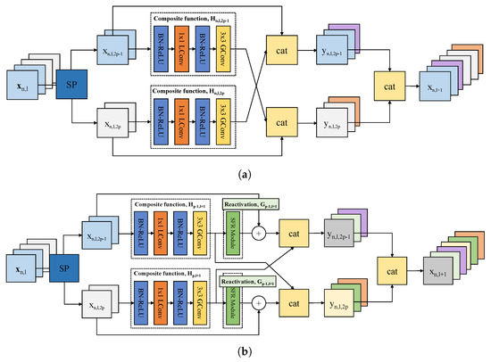 Figure 3 is an example of dividing the path into two (P = 2) in the lth layer. In Figure 3a, when l = 1, MLDN is explained as follows. First, input feature maps () split by the number of 2 (). These split input feature maps are passed through the composite function (). Next, they concatenate with the input feature maps of the opposite path (). Finally, all output feature maps are re-concatenated (). These output feature maps become the next input feature maps for the th layer. This is repeated on all layers. In this way, information is exchanged between paths. Each composite function has two iterations of BN, ReLU, and convolution maps in series. For the first convolutional layer, learned group convolution (L-Conv) removes unimportant connections. For the second convolutional layer, group convolution (G-Conv) reduces the computational cost by partitioning the input features. In the composite function process, the number of feature maps does not increase and a constant k, the number of feature maps, is generated because of a bottleneck layer. More information about the composite function is in [14].