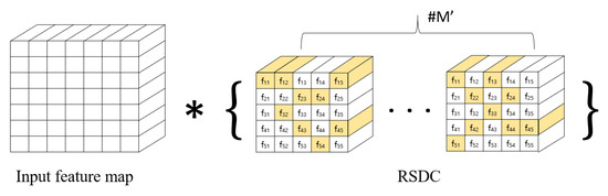 Figure 4 explains our RSDC when the kernel size of the RSDC is 5. The left side of the figure shows the input feature maps, * is the convolution symbol, and the right side of the figure shows the RSDC, where RSDC consists of feature maps. In this case, there are 25 weights. If we use this value as it is, however, it is the same as increasing the receptive field. We randomly select 9 of these weights and perform convolution with them. The reason for choosing 9 weights is that the size of the existing standard convolution is .