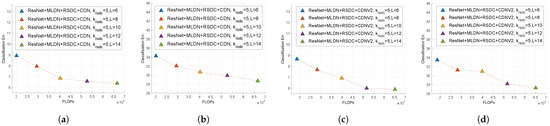 Second, we changed the number of layers. In [14,15], the condensation factor (C) and the number of groups (G) is 4. The condensation factor is the removal rate of the filter weight. With this factor, it is impossible to experiment with varying reductions in L for computational reasons such as size mismatch. Therefore, we changed this factor to 2. We changed L by 2 from 6 to 14. The smallest number of FLOPs and parameters is when L = 6, and the largest number of FLOPs and parameters is when L = 14. The classification error at L = 10 in Figure 8a or L = 12 in Figure 8c,d is similar to the previous classification error, but since the number of FLOPs is reduced by about 15 million, it is the best choice to obtain the lowest classification error with respect to the the number of FLOPs. When the number of layers is smaller than the L mentioned above, the classification error tends to increase remarkably because , the number of output feature maps of RSDC, is not sufficient.