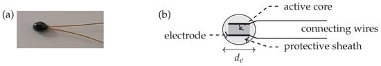 Miniature NTC thermistors of bead-type generally consist of an active core (see Figure 1), composed of a semiconducting metal oxide with negative temperature coefficient, protected by a glass, nylon or epoxy sheath. While the active core can sometimes have a spherical shape, it is, rather, usually in the shape of a slab (see Figure 1b). In order to allow the circulation of an electric excitation current through the core, two small metal electrodes are deposited on it, also allowing for measurement of its electric resistance , which depends on the core average temperature T.