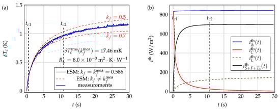 Experimental and 1D ESM computed thermal signals in the case of water–glycerol mixture 50W50G at rest. These signals were obtained using a voltage step excitation at a working temperature and immersion length : (a) measurements and ESM results; (b) computed thermal current densities when the fluid thermal conductivity is set to the value in the ESM model. Thermal conductivities are given in .