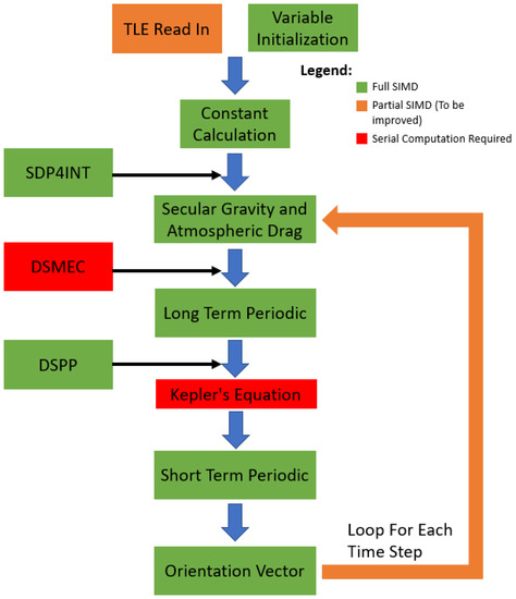 PSGP4 Algorithm Block Diagram, where the color represents the different implementations of SIMD processing. On the left of the main flow, the additional PSDP4 functions are shown with the location of the implementation.