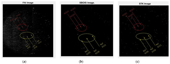 To validate the accuracy of the SBOIS to a readily available commercial product such as STK-EOIR, a comparison study using the identical orbital parameters in both simulators was conducted. Images taken by FAI on 15 June 2019, 23:35:50 to 23:36:15 were simulated. This time period was chosen to capture the first sighting of the RADARSAT Constellation Mission (RCM) spacecraft after they were launched on 12 June 2019. Their distinct formation of three spacecraft, combined with other reference stars within FAI’s field of view help not only in determining the pixel locations but also in identifying and correcting for potential lens distortions since it forms a geometrical shape rather than a single data point. Three stars from the Bright Star V5 catalog—#6111, #6158, and #6195—were used as references to prevent errors caused by discrepancies in the simulation of the attitude of the observer spacecraft CASSIOPE. They were chosen for their unique in-line formation that is almost parallel to the RCM formation during the observation period used in this study.