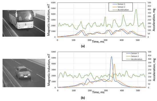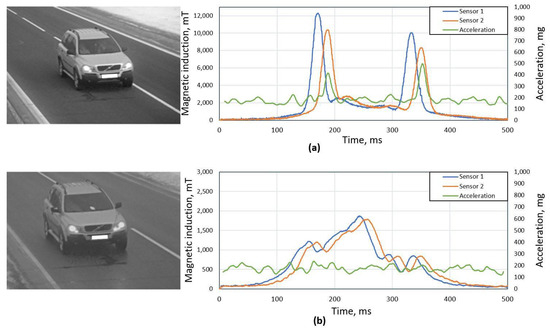 An example of same vehicle passing traffic monitoring station in two ways: (a) right side wheels are directly passing over the sensor, (b) vehicle driving at the center of sensor hub. In the plots next to the images, temporal data of magnetic signature of two magnetic sensors and accelerometer signal are shown.