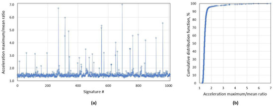 (a) Accelerometer maximum/mean value ratio distribution for the current test group of 1000 unique signatures with (b) cumulative distribution function (CDF). As it is visible, 95.7% of all cases has a ratio below 2.