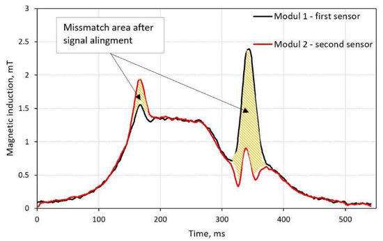 Normally, if the vehicle passes at the center of magnetic sensors, a pair of magnetic signals are identical and just shifted in time (shape and area of curvature should match). In order to detect distorted signatures, one could compare the mismatch area of curvature (Figure 4). Needless to say, signals must be aligned in time, and cross-correlation is the preferable method. It is done by finding a lag of two signals and then subtracting it from the leading signal. In the example below, one can see two aligned magnetic signatures with mismatch area above 10% of the total figure area of the first signal.