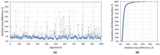 (a) The mismatch criteria distribution for the whole dataset of 1000 signatures and (b) cumulative distribution function (CDF) for the same data. The average mismatch between two aligned curves is 5%, and 95% of all cases have criterion below 10%.