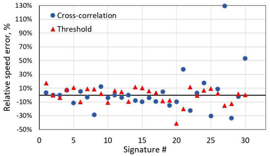 Relative speed error of the test group with distorted signatures with two methods. Relative speed error standard deviation for the cross-correlation method is 30%; for the threshold-based method, it is 12%.