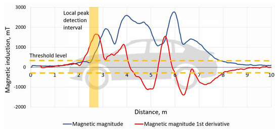 An example of vehicle magnetic magnitude and its 1st derivative signals. According to the above explained algorithm, the time-based signature is converted to a distance-based signal. Peak detection algorithm is employed to locate the very first and the last significant peaks above the threshold level.