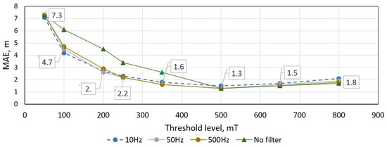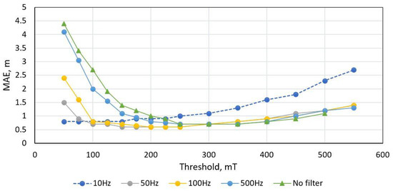 In order to tune methods for general purpose, values of parameters were estimated in the trial method. First, the threshold-based method was tested with different low pass filter cut-off frequencies (fc) and threshold values (Figure 9 and Figure 10). As it is visible in charts below, an initial filtering is necessary to remove noise, but fc lower than 500 Hz does not help to reduce error. Furthermore, it is visible that minimum MAE (1.3 m) is reached at threshold level 500 mT.