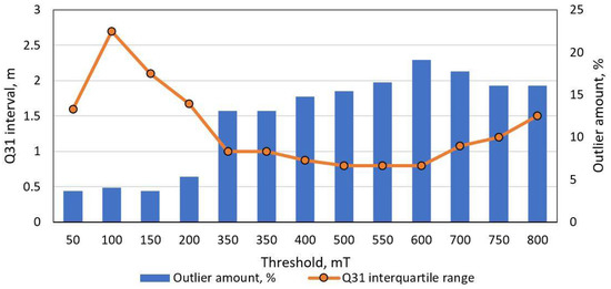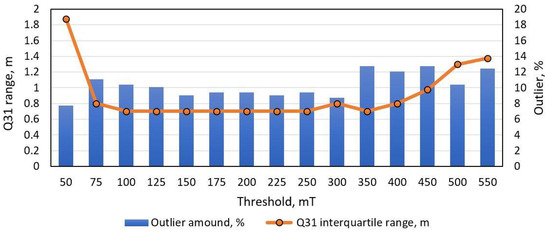 Threshold-based length estimation method performance versus threshold level. The orange line depicts interquartile range while columns indicate number of outliers. Dataset of 300 unique vehicle used, filtered with 50 Hz LPF.