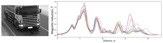 The second dataset contains multiple signatures of the same vehicle. In an ideal case, the same vehicle should produce identical signatures and shall result in the same estimated length. However, in real traffic conditions, the magnetic signature varies in shape. In Figure 13, the multiple signatures of the same truck with a tank are presented. Signals are rescaled according to speed and aligned by the first significant peak.