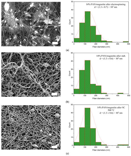 In the study of Trabelsi et al., the PAN/magnetite nanofiber diameter after electrospinning amounted to (1.8 ± 0.5) × 102 nm [21], in the study of Döpke et al. [2] to (1.2 ± 0.4) × 102 nm and in the study of Fokin et al. to (1.0 ± 0.5) × 102 nm [58]. The diameter of nanofibers in this study amounts to (1.3 ± 0.7) × 102 nm and a significant difference between the results and other studies [2,21,58] was not observed. In general, it could be stated that the nanofiber diameter of PAN/magnetite nanofiber mats after electrospinning [2,21,58], as well as stabilization and carbonization at 500 °C and 800 °C [58], is not significantly different from previous studies. In the study by Fokin et al., the PAN/magnetite nanofiber diameter after stabilization amounted to (1.7 ± 0.7) × 102 nm [58] and in this study to (0.1 ± 0.6) × 102 nm and after carbonization at 500 °C amounted to (1.4 ± 0.5) × 102 nm and in this study to (1.3 ± 0.6) × 102 nm. Moreover, the nanofiber diameter after carbonization at 800 °C was (2.0 ± 0.9) × 102 nm in the case of Fokin et al. [58] and (1.8 ± 0.8) × 102 nm in this study. However, it should also be mentioned that these differences in nanofiber diameter are not significant statistically due to the wide dispersion of the measured fiber diameters. In addition, the arbitrary choice of the investigated sample areas also partly plays a role.