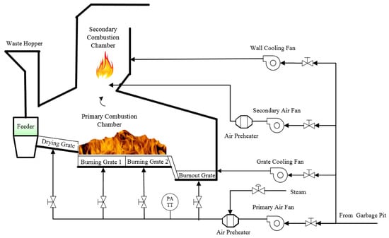 First, the MSW is sent to the incinerator through the feeder; under the effect of high temperature radiation from the chamber and convection heat transfer of primary air, the water drying process is carried out along the direction of the drying grate. Then the dried waste, placed on the burning grate (a total of two stages, burning grate 1 and burning grate 2), is used for the precipitation of volatiles. Finally, the fixed carbon in the waste is burned to form carbon oxides in the burnout grate. At the same time, the separated volatiles are burned in a combustion chamber with oxygen from primary air, and incomplete combustion volatiles are further burned under the influence of the secondary air.