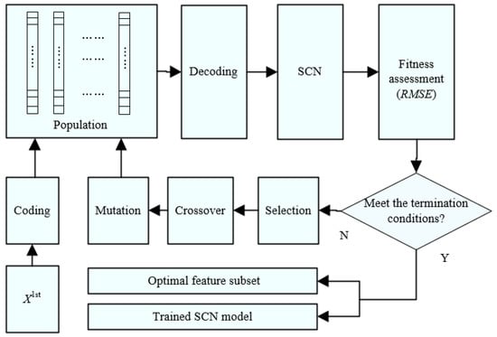 The primary feature selection based on MI only considers the correlation between each feature variable and y, however, it ignores the relationship between the variables. Therefore, based on the feature selection of MI, this section combines the GAs [] proposed by Holland with the SCNs [] provided by Wang to form a wrapper method for GA-SCN. The procedure is shown in Figure 2. First, feature variables in the feature subset X1st after the primary selection are coded, and initial population constitutes chromosomes. Then chromosomes in the population are decoded to obtain the feature subset, and RMSE is obtained by training the SCN model for assessment fitness, and a new generation of population is formed through the selection, crossover and mutation of chromosomes. The above process is repeated until the SCN model that meets the accuracy requirements is finally obtained.