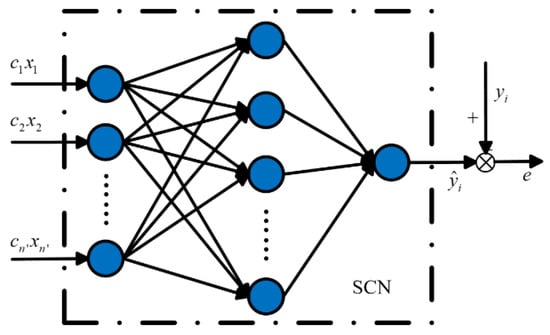 The stochastic configuration network, proposed by Wang et al. is a randomized method with universal approximation property []. Compared with traditional artificial neural networks, SCNs randomly assign the parameters of the hidden layer nodes in the light of a supervisory mechanism and evaluate the connection weight between the hidden layer nodes and the output layer nodes, which greatly avoids the influence of neural network learning ability from artificial experience, and its training efficiency also has obvious advantages. There are three learning algorithms provided by []. The proposed SC-III algorithm is used in this paper, whose supervisory mechanism and training process are described below.