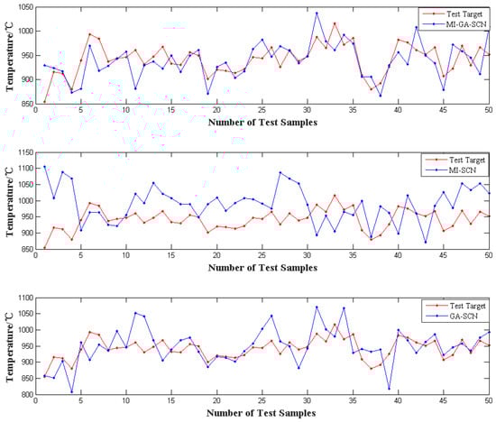 In addition, in terms of the number of features, the MI-GA-SCN method selected the least number of features, followed by GA-SCN, and MI selected the largest number of features, which indicates that the combination of filtering and wrapper feature selection methods could be appropriate for making up for their respective shortcomings. The irrelevant variables and redundant variables were eliminated, and the efficiency of feature selection was improved. Simultaneously, the model accuracy significantly improved. Besides, in order to compare the fitting effects of the above three models on the incinerator temperature intuitively, the fitting conditions of the MI-SCN, GA-SCN and MI-GA-SCN incinerator temperature models were compared. The results are shown in Figure 4. It can be seen that the incinerator temperature model obtained by the MI-GA-SCN method can better simulate the change trend of the actual incinerator temperature.