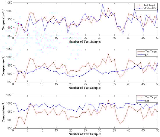 Fitting of incinerator temperature by SCN, BP and RBF.