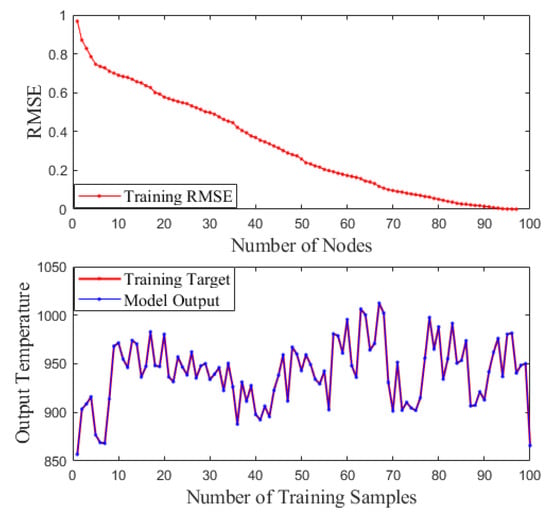 The modeling methods are also a key factor affecting the quality of prediction modeling results except for the appropriate feature selection methods. In this paper, the feature subsets, obtained by the MI-GA-SCN method, are used as input variables of the BP and RBF. The BP and RBF incinerator temperature prediction models were obtained by training, respectively, and the SCN incinerator temperature prediction model was obtained by the MI-GA-SCN method. The performance of the above three incinerator temperature models was compared, which is shown in Figure 5. It can be seen that the SCN model is better than the BP model and the RBF model for fitting the incinerator temperature. In addition, Table 3 is the RMSE comparison results of the above three models. From the RMSE perspective, the prediction accuracy of the SCN model is higher than the BP model and the RBF model. The main reason for the above results is that SCNs have the universal approximation properties for nonlinear functions and the network structure and parameters are configured adaptively, which avoids the influence of artificial experience on neural network learning ability. Moreover, the training situation of the SCN model can also be intuitively seen from Figure 6. This shows that the training RMSE of the SCN model reduces to 0 approximately with the hidden layer nodes increasing, which proves that SCNs have advantages in the approximation ability of nonlinear functions again.