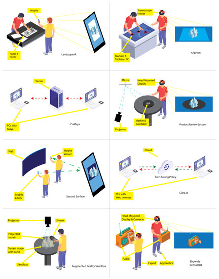 ShowMe [24] is a collaborative system that facilitates immersive gestural communication between users, a local apprentice, and a remote expert. The apprentice uses a HMD (Head Mounted Display) equipped with two cameras that capture his stereoscopic view, which is sent to the expert, who also uses a HMD. The expert has a depth sensor whereby the HMD captures his hands, to be shown on the local apprentice’s 3D scene, using AR. Additionally, the designers of ShowMe propose RemotIO [25], whereby the remote expert can manipulate a radio through manual gestures [26]. Hence, the expert can show the apprentice gestures made with his hands and their effect on the radio since it reacts in real-time. This is a work where collaboration stands out. However, it is aimed at expert users and requires highly specialized equipment.