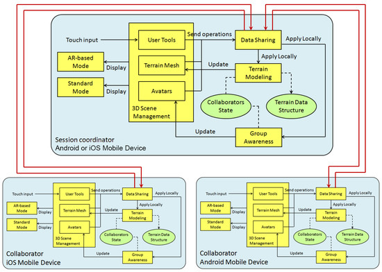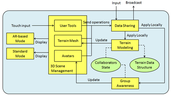 In the following subsections, several design considerations about the main components of the ShAREdT architecture are described: standard and AR-based interaction modes of the 3D scene (see Section 3.1), terrain modeling (see Section 3.2), 3D scene management (see Section 3.3), awareness information for coordinating group work (see Section 3.4), and data sharing for the concurrent creation and modification of a terrain mesh (see Section 3.5).