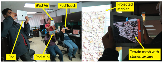 Some participants using the AR mode of our application while the marker is being projected on a wall. The characteristics of the mobile devices are: (1) iPad 3rd generation. Screen size: 9.7 inches. Weight: 660 g, (2) iPad Air 1st generation. Screen size: 9.7 inches. Weight: 469 g, (3) iPad Mini 1st generation. Screen size: 7.9 inches. Weight: 308 g and (4) iPod Touch 5th generation. Screen size: 4 inches. Weight: 88 g. In all devices the camera is 5.0 MP.