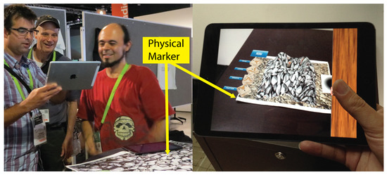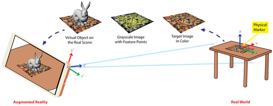 A different approach is that of AR, which creates the illusion of virtual objects existing inside the real environment. To achieve AR on mobile devices, the AR-based Interaction Mode component relies on effective computer vision and machine learning algorithms to recognize and track markers on which several digital contents can be added. This AR principle is depicted in Figure 4. The scene taken by the camera of a mobile device shows the physical marker placed on the table, which contains a target image, i.e., a formerly learned arbitrary image printed on it. Then, the mentioned algorithms transform the target image in greyscale to extract visual feature points on each frame of a video stream.