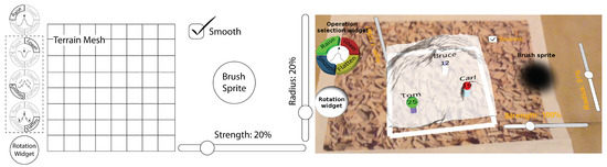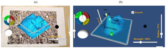 Figure 7 shows the user interface of the collaborative application developed to validate the ShAREdT architecture. The terrain mesh is shown at the center of the 3D scene. In the previous version of our collaborative application for terrain sketching [27,28,29], we observed that users searched for a strategy to rotate the terrain mesh, in addition to walking around the physical marker. Therefore, as shown in Figure 7, we added a rotation widget that acts as a trackball, which spins the terrain mesh around two axes. This widget is also available when the user interacts with the application in standard mode. The user can rely on the rotation widget to visualize its shape from any perspective, together with an extra-slider to zoom in/out the terrain mesh.