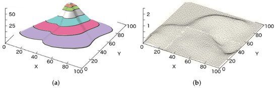 (a) The plot of a continuous elevation map with level curves, and (b) the plot of a DEM: for every point of the discrete domain, a discrete height value exists.