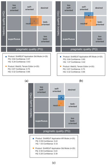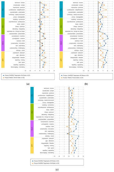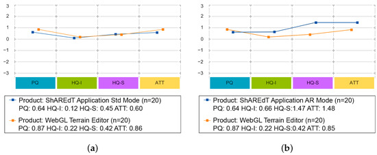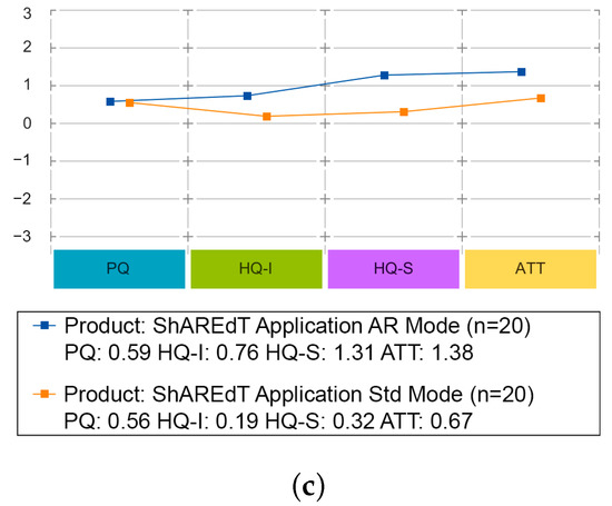 Figure 13 features charts of average values for the pragmatic quality (PQ), hedonic quality identity (HQ-I), hedonic quality stimulation (HQ-S), and attractiveness (ATT) dimensions. These kind of graphs has a range that varies from −3 to 3, denoting the scale of seven steps that each semantic differential has (lower is worse). Figure 13a shows that WebGL and ShAREdT in standard mode mainly received similar neutral evaluations, since the values in all dimensions are close to zero, but WebGL has a very slight advantage. In Figure 13b, ShAREdT in AR mode obtained more favorable results than WebGL, which was just slightly better in PQ. Figure 13c shows that ShAREdT was better evaluated in AR mode than in standard mode, and they almost tied in PQ.