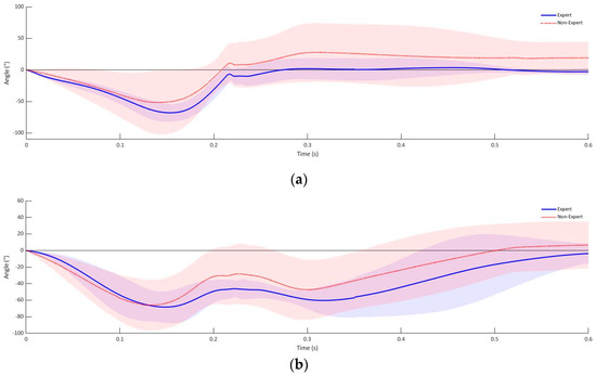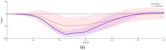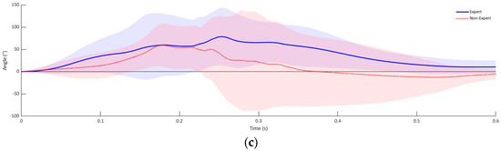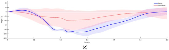 The movement of the fist towards the target object begins with a rotation in the longitudinal axis (Figure 6). This movement is followed by a temporally offset alignment of the fist around the transversal and sagittal axis (Figure 6). At the moment of the fist hitting the targeting object, the fist was rotated from the defensive position by an average of −11.75° (SD = 11.17°) in the longitudinal axis in the experienced group of test persons (Figure 6). With an average difference of 12.97° (95% CI [−10.31°, 28.26°]) the non-experienced group of subjects shows an average rotation of −24.72° (SD = 23.42°) in the longitudinal axis (Figure 6). The transversal rotation, which starts after the initial rotation in the longitudinal axis, had an average of −41.59° (SD = 3.12°) for the experienced group of test persons and −43.38° (SD = 13.92°) for the non-expert group until the fist hits the punching bag (Figure 6). This corresponds to a mean deviation of −2.21° (95% CI [−7.47°, 7.04°]) between the two tested groups. The third rotation in the sagittal axis shows a mean difference of the fist from the defensive position to the target of −36.16° (95% CI [−51.75°, −20.56°]) between the experienced test group (−82.2° (SD = 8.48°)) and the non-experienced test subjects (−46.04° (SD = 28.87)) (Figure 6). The rotation around the longitudinal and transverse axis from the defensive position to the object showed no statistically significant difference between the two tested groups’ rotation around the longitudinal axis (p = 0.35) and rotation around the transverse axis (p = 0.97). In contrast to the first two rotations, the rotation around the sagittal axis showed a statistically significant difference between the two groups in the rotation from the defensive position to the first contact with the target (p < 0.001) (Figure 6).