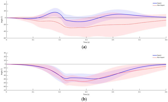 As demonstrated in Figure 4, it becomes apparent that the orientation of the fist to the object to be punched is initiated with a rotation around the longitudinal axis before the fist is orientated in the direction of the object to be hit in the transverse and sagittal axis. During the contact of the fist with the object to be struck, a mean rotation of 0.15° (SD = 13.27°) in the longitudinal axis is seen, compared to the initial defensive position of the experienced athletes. The rotation in the longitudinal axis at the time of the fist impact was higher for the group of inexperienced athletes with −7.81° than for the group of experienced athletes (95% CI [−13.61°, 29.23°]). Following the start of the rotation in the longitudinal axis, the fist of the experienced group of subjects is rotated by an average of −42.97° (SD = 3.1°) in the transversal axis and −86.21° (SD = 4.7°) in the sagittal axis up to the moment of contact with the object of impact (Figure 4). In comparison, the group of inexperienced athletes performed a rotation around the transverse axis of −39.75° (Figure 4) (SD = 10.41°) and a pronation of 59.41° (SD = 21.49°) in the sagittal plane until a first contact with the target (Figure 4). This corresponds to a mean difference of −3.22° (95% CI [−8.81°, 2.37°]) in the transversal axis and 26.81° (95% CI [15.84°, 37.78°]) in the sagittal axis between the inexperienced and experienced group of test subjects. The results of the rotations around the longitudinal and transverse axis from the initial defensive position to the impact of the fist on the striking object showed no statistically significant differences between the experienced and non-experienced group of test subjects, rotation around the longitudinal axis (p = 0.45) or rotation around the transverse axis (p = 0.24). A significant difference between experienced and non-experienced subjects was detected in the rotation around the sagittal axis from the defensive position to the initial contact (p < 0.001).